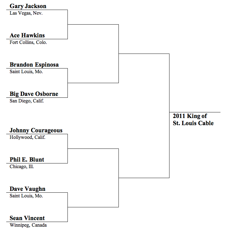This is the bracket for the 2011 King of St. Louis Cable Cup tournament. The single-elimination competition will take place on October 29. A champion is represented in each first round match.