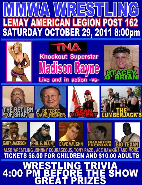 The bell is at 8 PM, but merchandise man Nick Ridenour is sponsoring a wrestling trivia competition at 4 PM. If interested, call him at (314) 631-3878. The MMWA hopes that all of the great South Broadway fans join us at American Legion Post 162 for this memorable tournament.