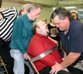 Before the match, MMWA-SICW Executive Director Tony Casta demanded that Ruddick’s manager, Travis Cook, sit in a “special chair” at ringside.  The “special” part was binding Cook to the steel with duct tape — there was no way Travis would interfere in this one.
