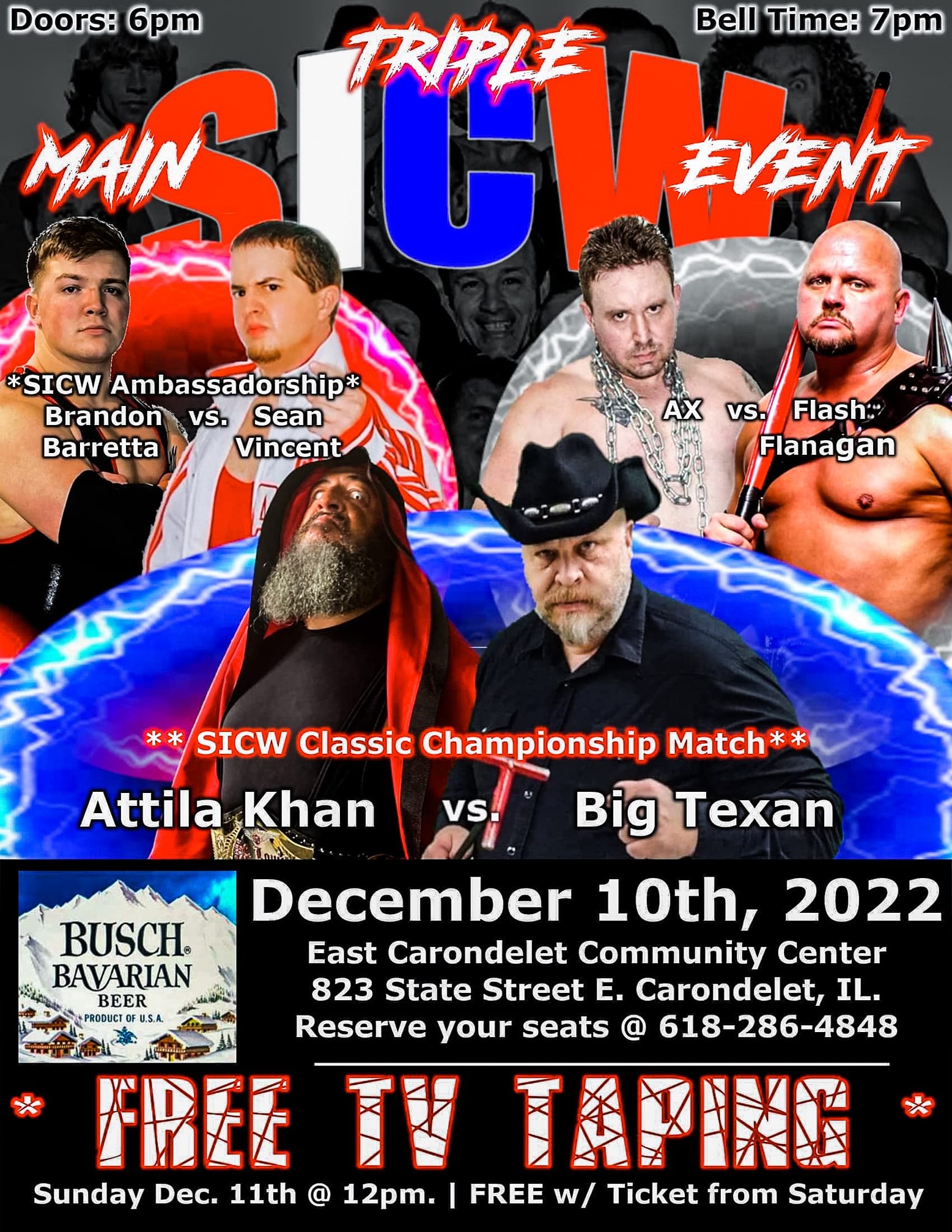 Brandon Barretta pinned Sean Vincent in a No Disqualification match after hitting Vincent with his own boot to become the new SICW Ambassador – 8:43
